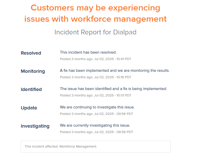 If you click on the description, you’ll be taken to the Incident Report, which provides a timeline of updates from Dialpad, such as:
