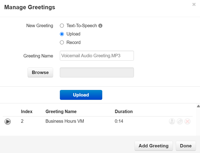 - Click on the newly uploaded voicemail greeting to confirm it has been applied.